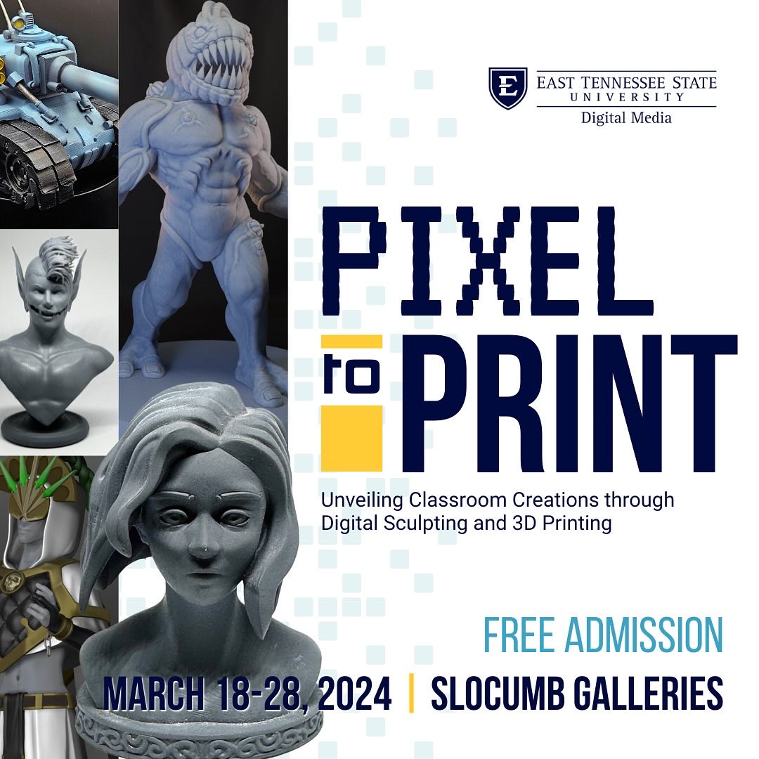 In Spring 2024, Professor Sarit Somasa organized the "Pixel to Print: Unveiling Classroom Creations through Digital Sculpting and 3D Printing" artshow at ETSU Slocomb Galleries in Johnson City, Tennessee. Working for the department, my job was to help with designing marketing graphics, and helping document the event for social media.